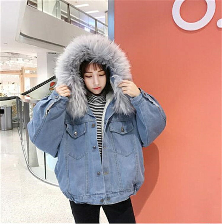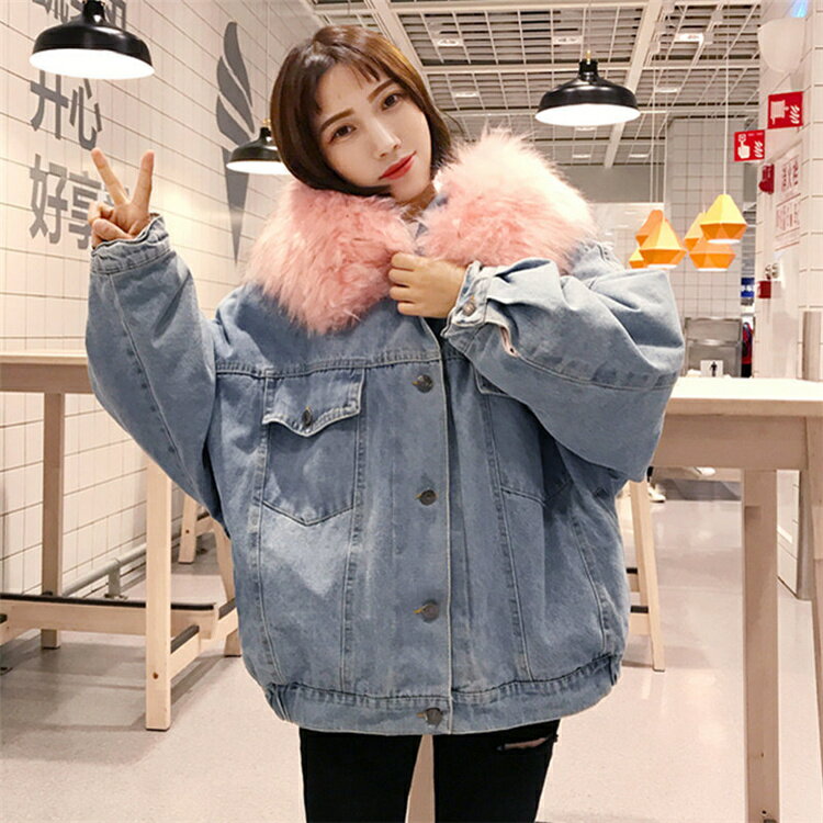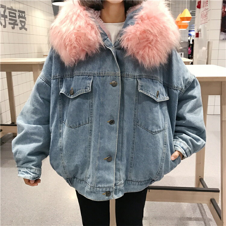ゆったり 裏起毛 毛皮の襟 デニムジャケット 暖かい コットン学生トレンド(T)